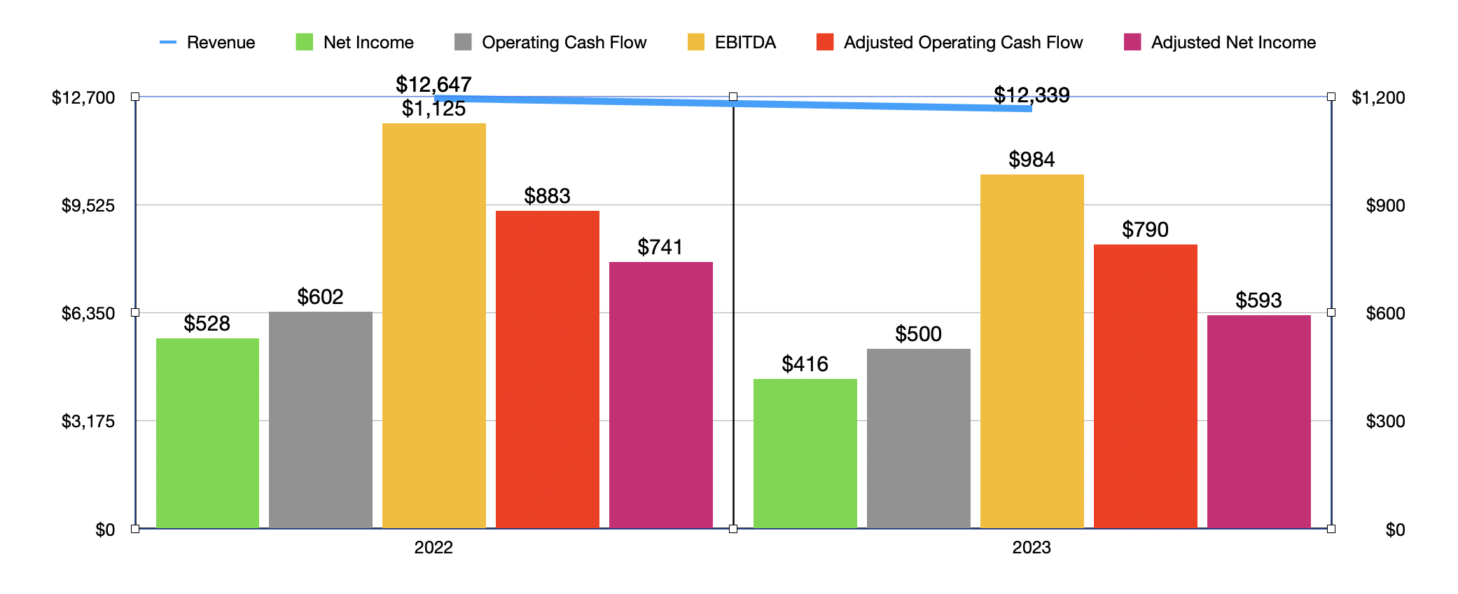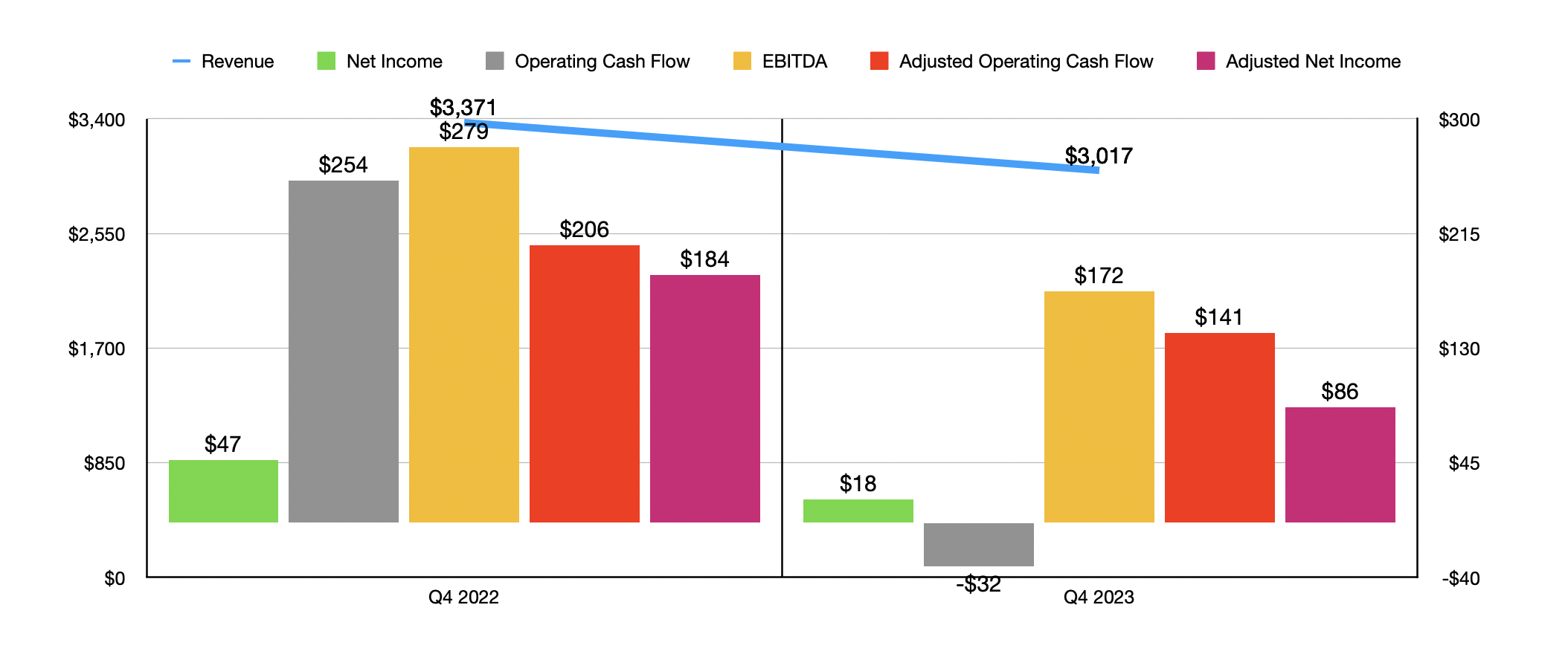 I would say that the final quarter of 2023 was the most brutal for the company. But as a whole, 2023 was not pleasant. In the chart above, you can see revenue, profits, adjusted profits, and certain cash flow metrics for the company for that year relative to the year prior. By every measure, the picture worsened year-over-year.