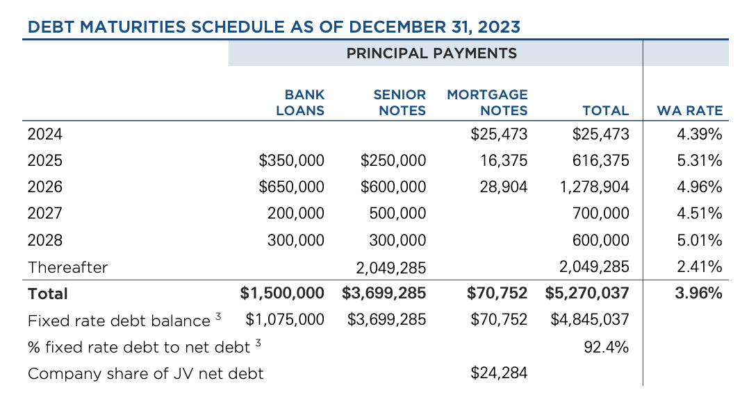 The Supplemental has a complete list of debt as of 31 Dec 2023, and a summary schedule of debt maturing through the end of decade. There is also a summary of debt covenants and liquidity, which indicates little to no current risk of bumping up against covenants. The $1.5 billion credit facility maturing October 2027 is notably completely undrawn. There is very little mortgage burden.
