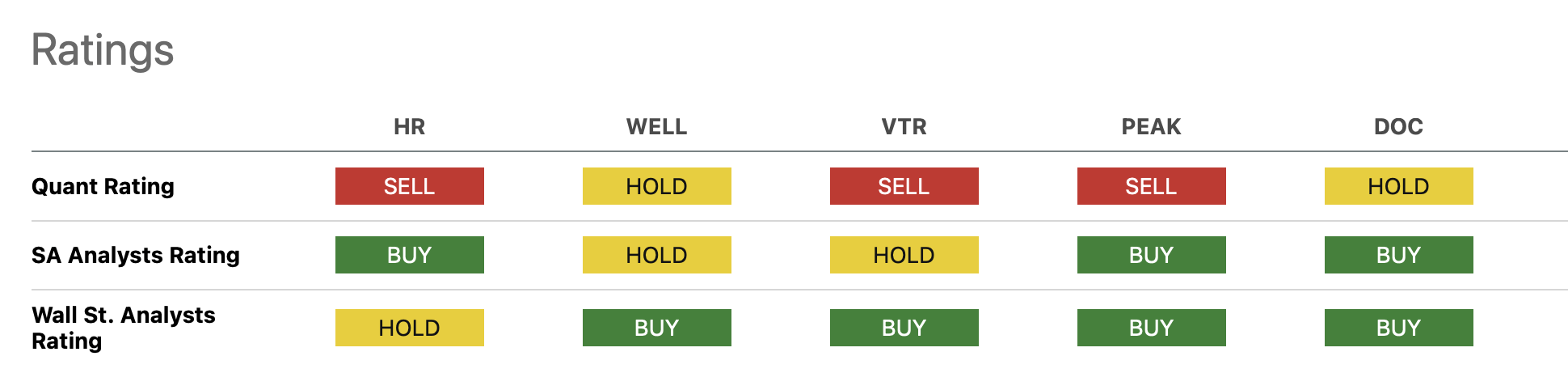 The forward looking assessments, particularly Seeking Alpha's Quant Ratings, are not enthusiastic for HR, or the MOB REITs generally.