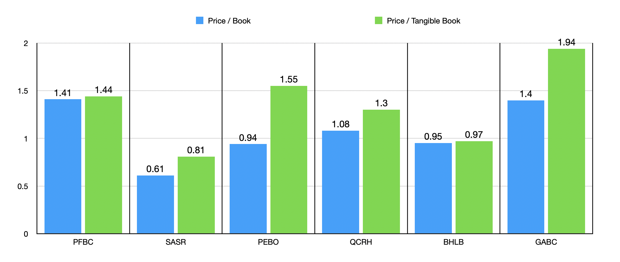 In terms of valuing the bank, there are a few different ways that we can do this. First and foremost would be using the price to earnings approach. Using the data from 2023, Preferred Bank is trading at a price to earnings multiple of 6.4. That's toward the lower end of the spectrum from what I have seen over the past year or so. In the chart above, you can see how the price earnings multiple of the bank stacks up against five similar firms. Undoubtedly, Preferred Bank is the cheapest of the group. In the table below, meanwhile, you can see how shares are priced using the price to book approach and the price to tangible book approach. In this case, instead of being the cheapest of the group, Preferred Bank is one of the more expensive. Using the price to book approach, our prospect is the most expensive of the group. And when it comes to the price to tangible book multiple, only two of the five companies was more expensive than it.