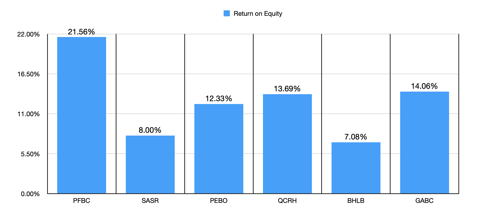 From a valuation perspective, we clearly have a bank that is rather mixed. It's cheap relative to earnings, and it's expensive relative to book value. Relative to tangible book value, it's close to the middle of the pack. To see which direction our sentiment should go, the next thing we need to do is see the quality of the earnings the institution generates. I did this using two different approaches. In the first chart below, you can see the return on equity, not only for Preferred Bank, but also for these same five companies I compared it to already. With a return on equity of 21.56%, it's at the top of the list. And in the chart below that, you can see the other method, which is the return on assets. Once again, Preferred Bank looks to be at the high end of the spectrum.