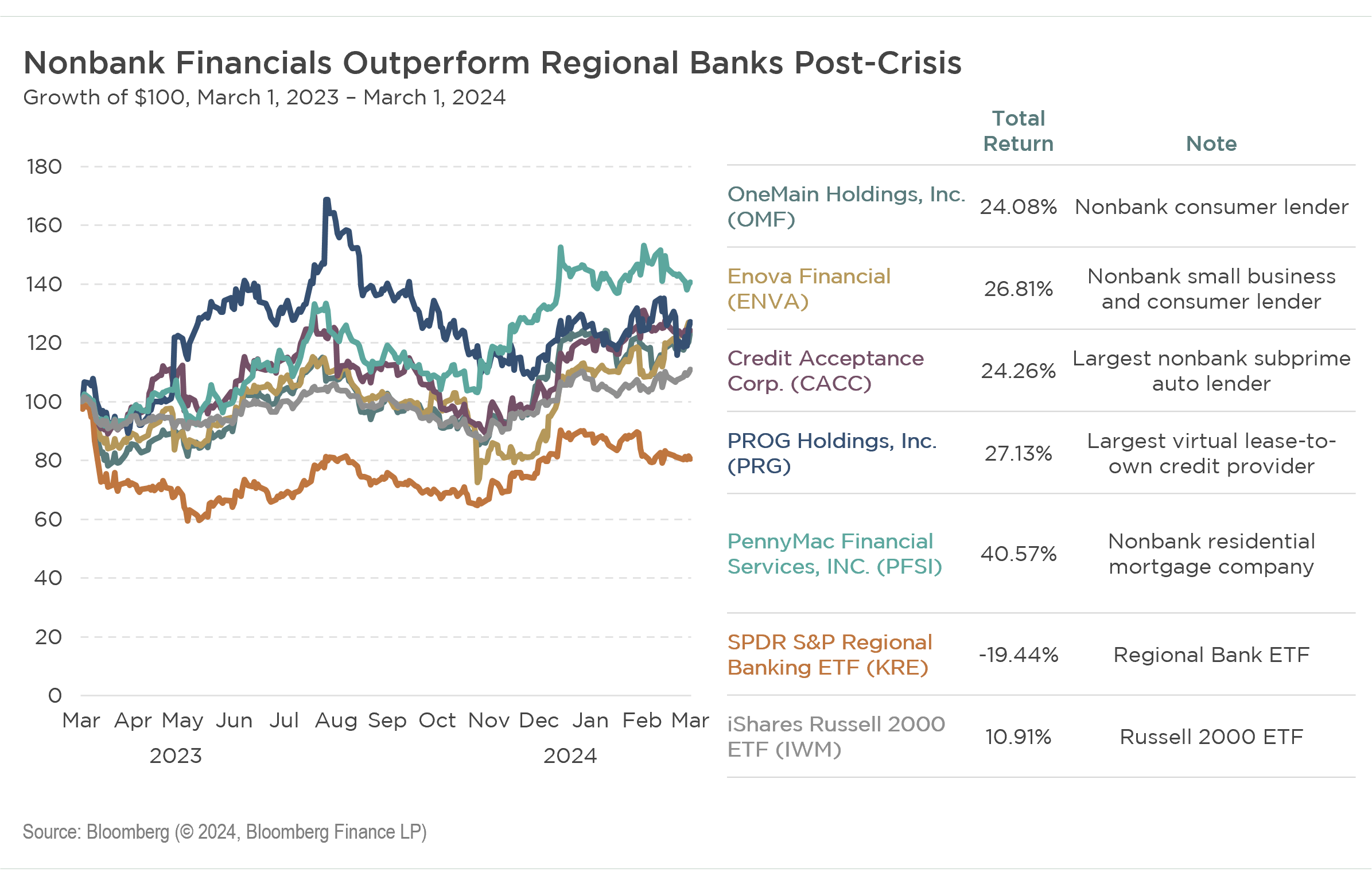 Since the 2023 regional bank crisis began one year ago, the stock performance of select nonbank financials stands in marked contrast to the performance of U.S. regional banks as measured by the SPDR S&P Regional Banking ETF and small caps more broadly as measured by the iShares Russell 2000 ETF.