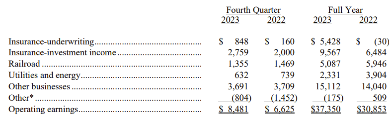 Berkshire 2023 Operating Earnings (Berkshire Hathaway Website)