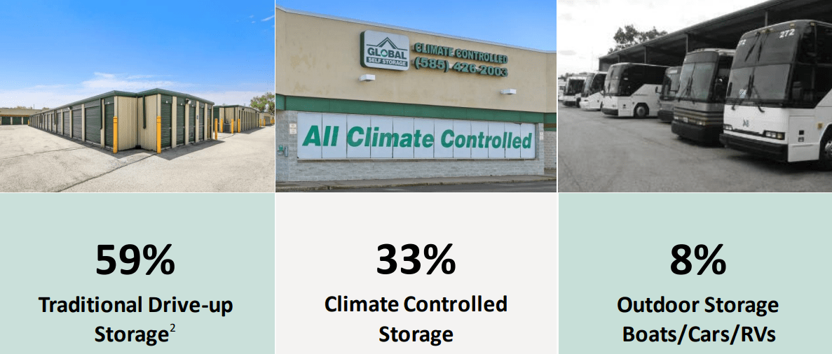 As of its most recent update, 59% of its properties are traditional storage, 33% are climate controlled, and 8% of its properties are outdoor storage designed for large vehicles and vessels.