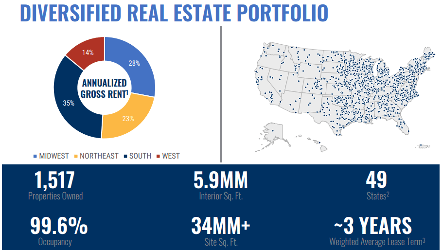 Since its IPO in 2019, the company has grown its property count from 20 to 138, its number of states from 12 to 35, its portfolio square feet from 0.9 million to 3.8 million, and its ABR from $13.3 million to $38.8 million.