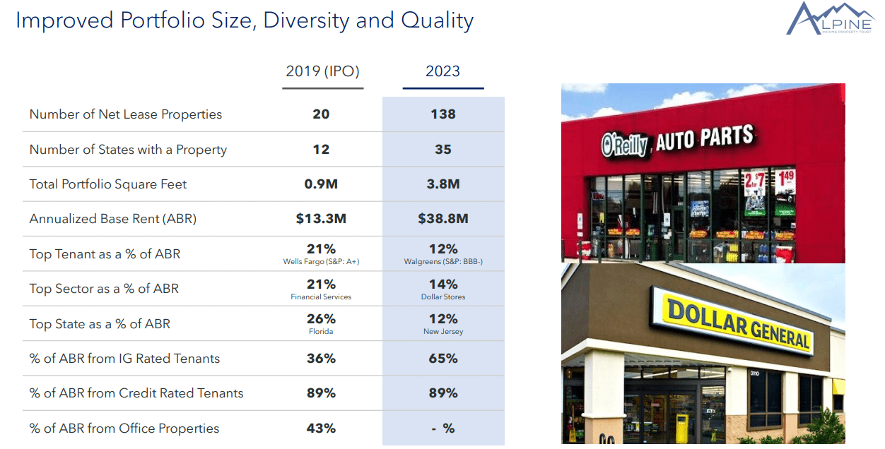 PINE is an externally managed REIT with a market cap of approximately $208.0 million and a 3.8 million SF portfolio made up of 138 net lease properties located across 35 states.