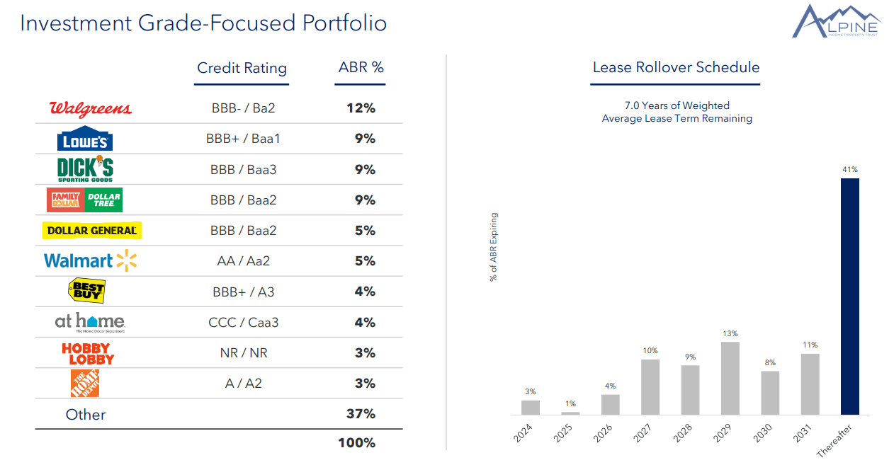 PINE's top tenants are a good reflection of the high-quality nature of its portfolio. Its top tenant is Walgreens, which made up 12% of the company's ABR, followed by Lowe's, which made up 9%.