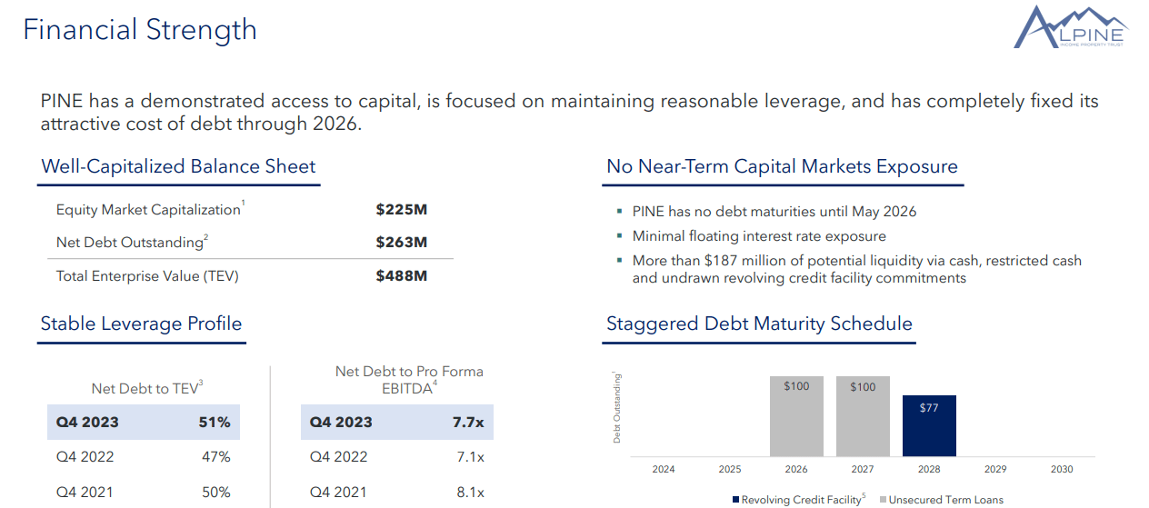 PINE has a net debt to pro forma EBITDA of 7.7x as of 4Q-23. While this is an improvement over its leverage ratio at the end of 2021 and 2022, it is still higher than I'd like to see.