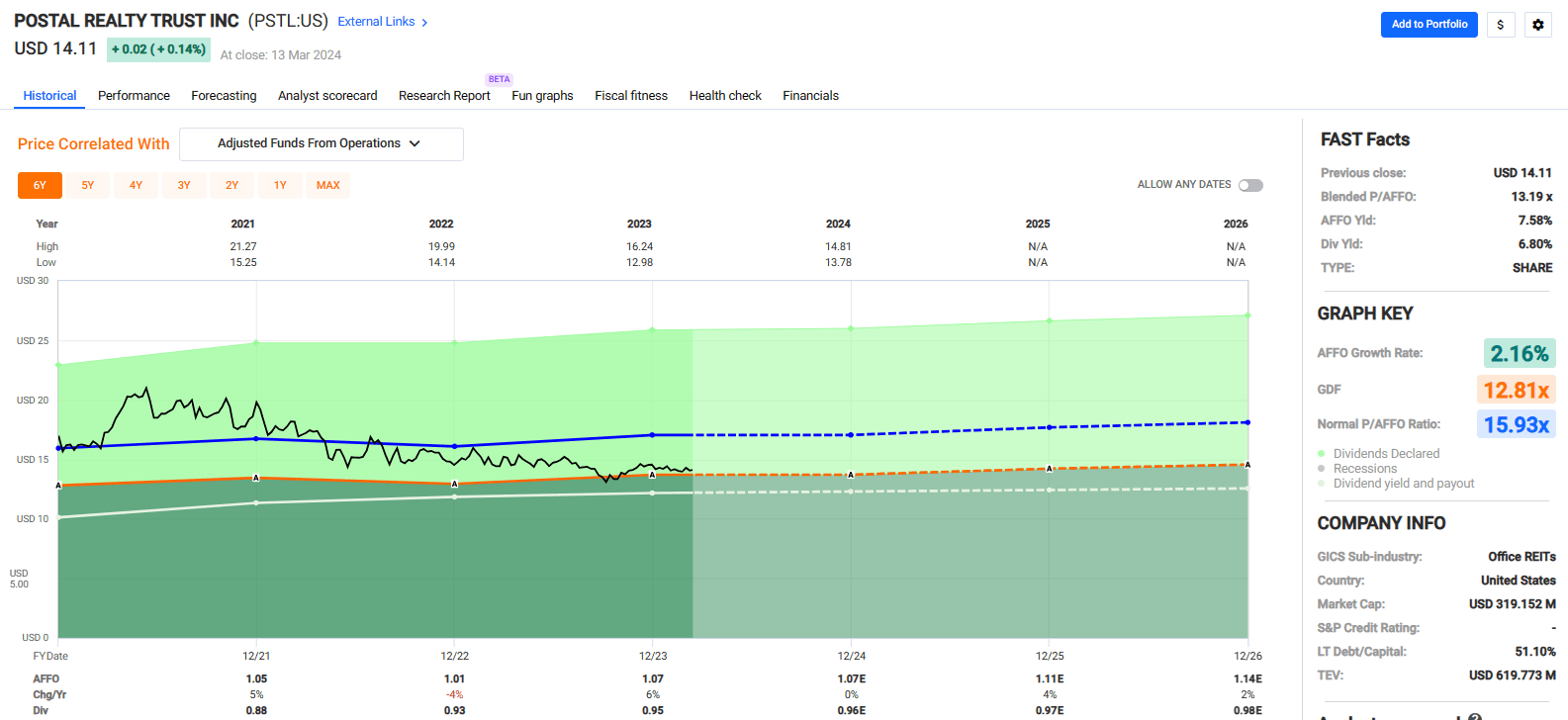 Since 2021, PSTL has had an average AFFO growth rate of 2.16% and an average dividend growth rate of 6.42%. Analysts expect AFFO to remain flat in 2024 but then to increase by 4% in 2025 and by 2% the following year.