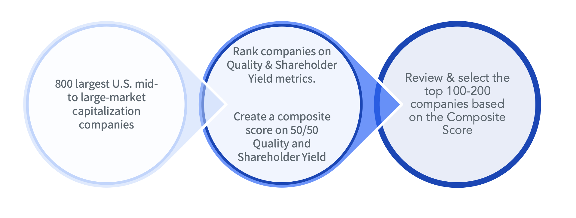 WTV uses quantitative algorithms to screen its universe of the 800 largest mid- to large-cap US companies. The metrics the managers evaluate are shareholder yield, given a 50% rank, and other traditional valuation ratios like return on equity (ROE) and return on assets (ROA), which comprise the other 50% rank. In a nod to address the level of financial leverage, the managers apply a qualitative look into their stock universe to weed out companies that are issuing debt to finance share buybacks. Their proprietary ranking system produces a list of the top 100-200 companies to include in their ETF.