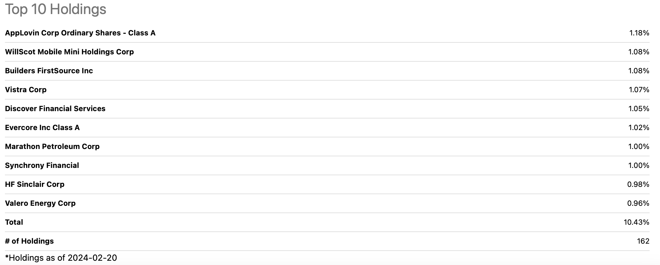 Twenty-seven percent of WTV is represented by large-cap companies, with mid-caps representing 54% and the remaining 19% in the small-cap space. With 162 holdings and the top 10 holdings representing only 10% of the ETF, concentration risk is low. The highest sector concentrations, representing roughly 50% of its composition, are financials (20%), consumer cyclicals (17%) and industrials (15%).
