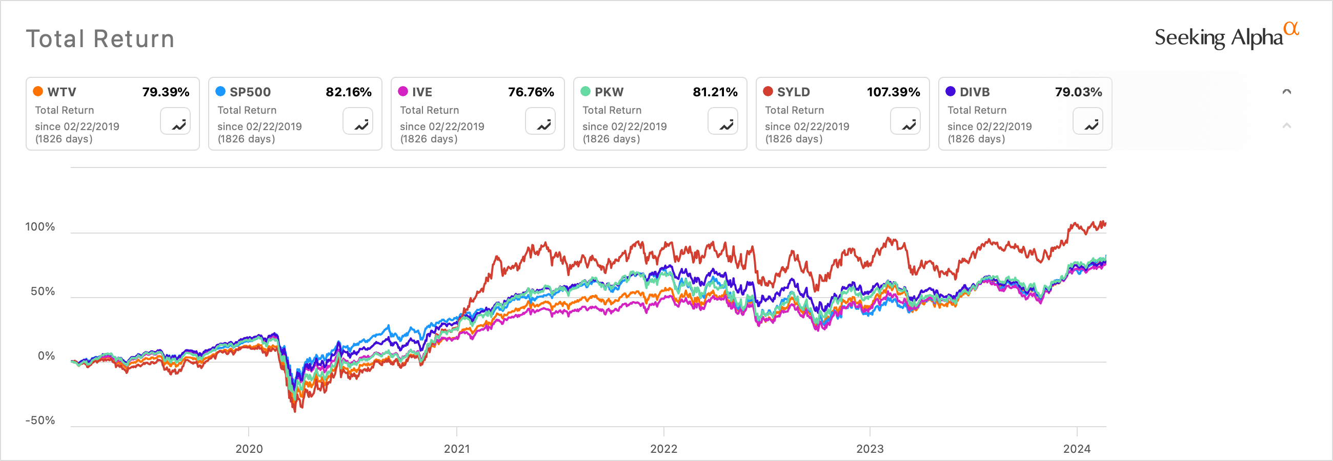 The WTV investment thesis of shareholder yield has not shown outsized returns to investors over the last several years but rather has maintained pace with the broader market. This may be because of the sector bets and the market cap size of the companies it vets. The fundamental analyst in me, however, thinks it has more to do with it leaving out the net debt paydowns in its shareholder yield screenings. Lower debt-to-equity ratios can leave companies more nimble and with lower risk as long as they employ capital for the "right reasons". The WTV managers also look for a forecasted P/E discount to the S&P 500 Index, which we use IVE as a proxy. Note there is a 21% discount, suggesting potential for multiple expansion. But, SYLD is trading at a 38% discount. These two ETFs are apples and oranges, similar yet different. Still, we rate WTV a Hold.