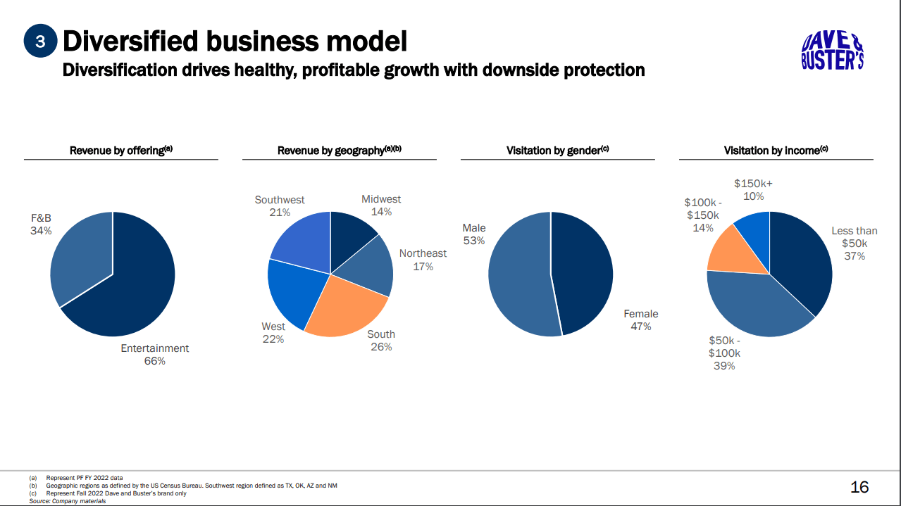 Due to this unique market position and brand recognition, Dave & Buster's is able to generate revenue through a combination of food and beverage sales, game sales, and private event bookings. The interconnectedness of these revenue streams helps create a diversified income model, reducing dependence on any single source but still behaving in a predictable, projectible way.