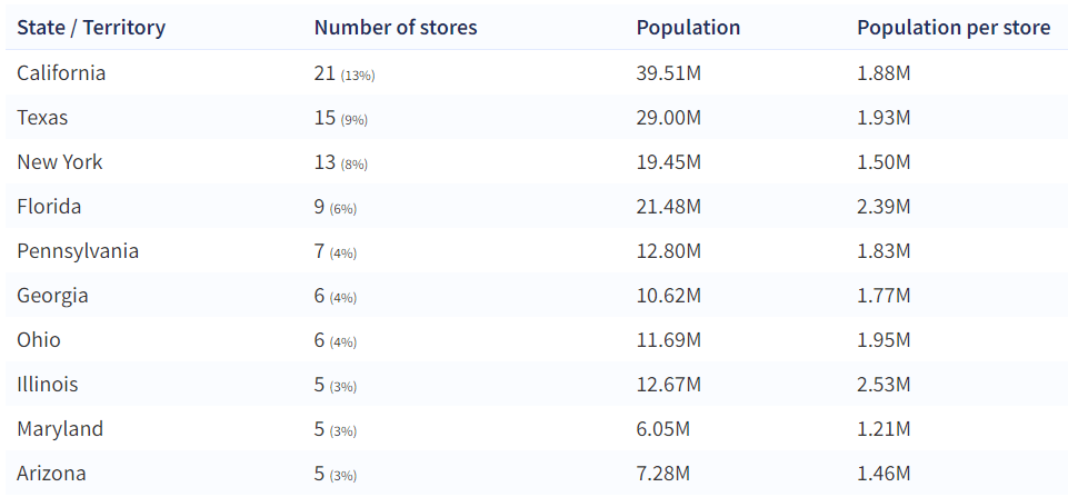 Dave & Buster's primarily operates in high-population dense areas in the states above. Management commentary has stated plans to achieve 252 by the end of 2025 with the long-term potential of 550+ stores. I feel this is too bullish of a projection unless Dave & Buster's were to show aggressive action toward this goal. In 2023, they opened 16 stores. For my bullish valuation, I applied a growth rate of 15 stores per year until 2030 resulting in a terminal value of 321 stores.