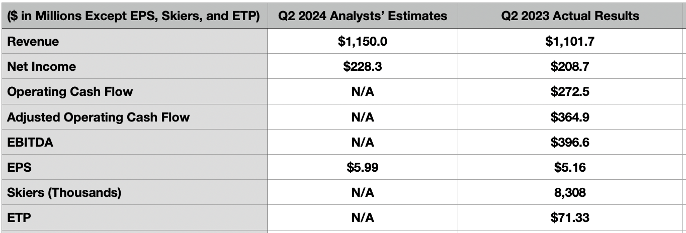 Earnings per share for the second quarter are expected to be about $5.99. This would represent a nice improvement over the $5.16 per share generated in the second quarter of 2023. That would translate to net profits rising from $208.7 million last year to $242.9 million this year. Other metrics do not have corresponding guidance. But in the aforementioned table, you can see operating cash flow, adjusted operating cash flow, and EBITDA for Vail Resorts. You can also see that, during the second quarter of 2023, the firm boasted 8.31 million skiers with an ETP of $71.33. I wouldn't be surprised to see the number of skiers decline somewhat year over year, even as a rise in the ETP increases sales.
