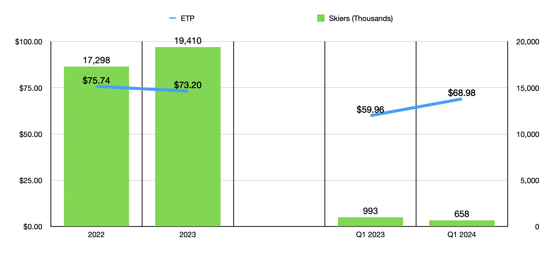 If you were to guess what financial performance would be for 2024 based on results for the fiscal first quarter of the year, you would likely be pessimistic. I say this because revenue of $258.6 million in the first quarter fell short of the $279.4 million generated one year earlier. Even though the company benefited from an increase in ETP from $59.96 to $68.98, it saw the number of skier visits drop from 993,000 to 658,000. This was driven, according to management, mostly by inclement weather. As a result of the decline in revenue, the firm's net loss expanded from $137 million to $175.5 million. Operating cash flow dipped from $333 million to $328.5 million, while the adjusted figure for this went from negative $122 million to negative $166.5 million. And lastly, EBITDA for the company fell from negative $97.8 million to negative $134.4 million.