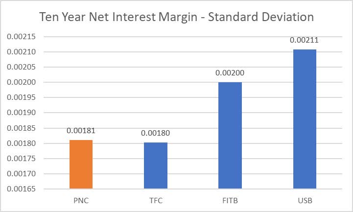I feel an additional significant factor to observe is the uniformity of the net interest margin. A stable net interest margin tends to indicate superior loan quality, while a fluctuating net interest margin generally signals inferior loan quality, this makes forecasting the bank’s future operations more complex and the outlook less certain. In the case of PNC, the net interest margin’s ten-year standard deviation is 0.00181, which classifies it with the second lowest NIM standard deviation amongst its peers. Hence, I consider this as evidence that PNC in recent times this company has shown efforts, in keeping its net interest margins stable when compared to other similar institutions. This suggests that there might be less risk associated with their loan book despite the underperforming NIM.