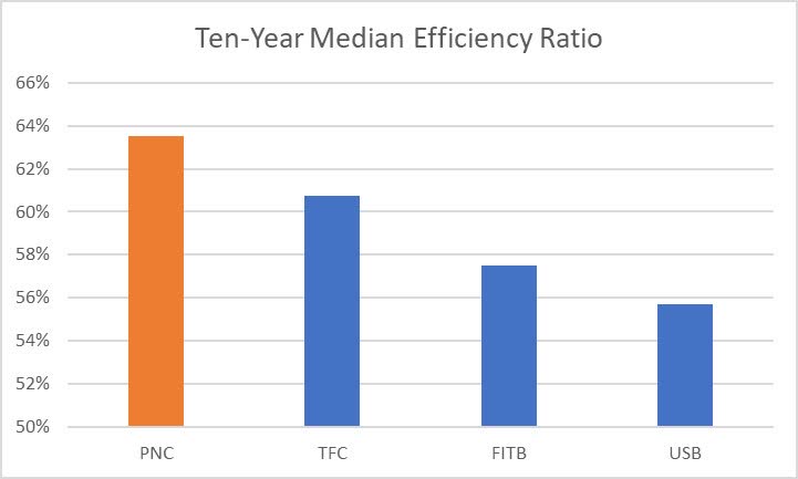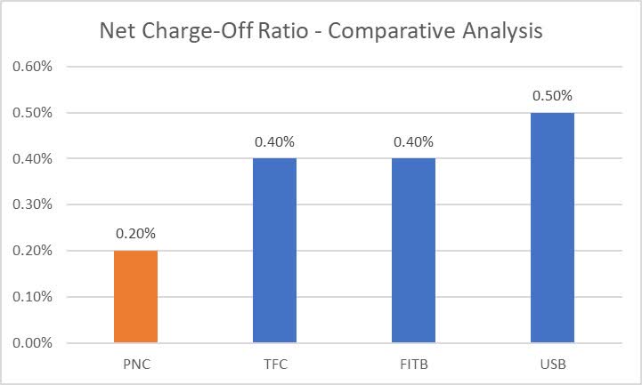 As we compare PNC’s ten-year median efficiency ratio in comparison to its counterparts, it is clear that TFC, FITB, and USB each possess a ten-year median net charge-off ratio of 61%, 58%, and 56%, consequently PNC is rated highest amongst its competitors. Thus compared to the other banks, there is most likely room for the management team to trim down on overhead costs to improve earnings.