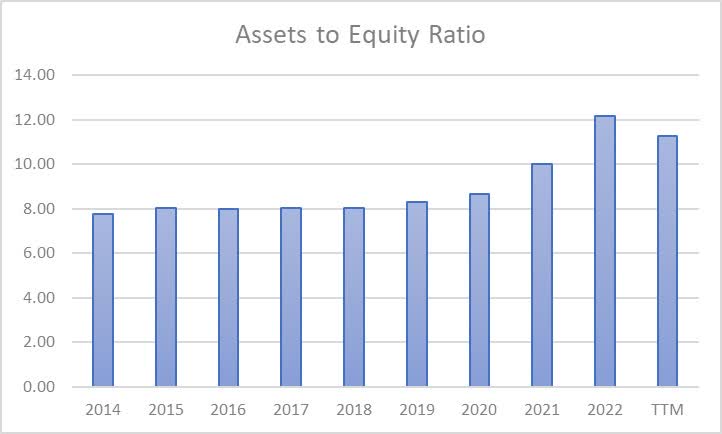 Leverage is another tool I like to use when assessing the balance sheet risk of banks. In particular, I believe the assets to equity ratio is a key driver of the future return on equity. Regarding my overall position, I find higher leverage acceptable when net charge-offs are minimal; conversely, I favor lower leverage if the bank engages in riskier loans like personal credit, construction loans, and auto loans. Regarding PNC Group, it has reported a decade-long median asset to equity ratio of 8.2, where it is clear that from 2015, to the twelve months PNC has been experiencing an upward trend in its assets to equity ratio especially in the periods where interest rates were on a downtrend. It reached its peak in 2023 at 12.17 before settling at 11.27 in the trailing twelve months. The long term trend signifies that the bank has been increasing its leverage possibly to support growth or enhance returns on equity. However the recent decrease indicates an approach, towards leveraging, which aligns with the broader industry’s focus on maintaining a strong capital structure to mitigate risks related to market volatility. It should be noted that the bank is still well above its own historic average despite the recent decreases.