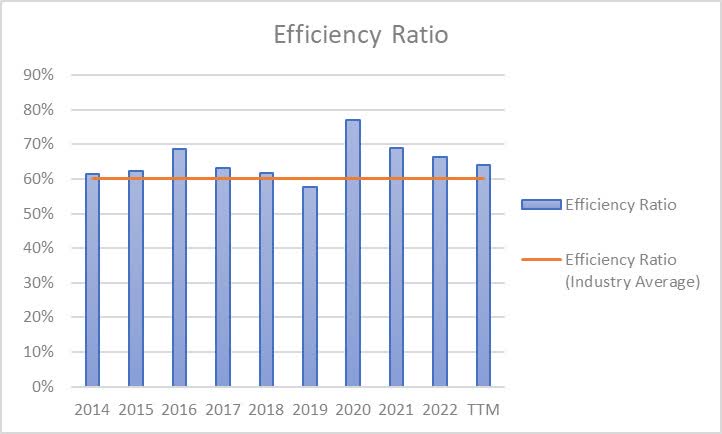 In my opinion, the efficiency ratio is a key metric for showing the effectiveness of banks in managing their overheads, where a 60% efficiency ratio is seen as the standard in the banking industry. Between 2015 and the recent twelve months PNC Banks efficiency ratio had its ups and downs reaching a peak of 77% and a low point of 58%. This indicates that the banks operational efficiency has shown some variability with periods of increased costs compared to revenue. Currently the efficiency ratio sits at 64% in the TTM period indicating an improving approach, to managing costs but the bank still sits above the ideal ratio of 60%. Since 2015, PNC has only managed to have their efficiency ratio below 60% one time in the last decade. Therefore, in my opinion this shows that the management team likely could have done a better job at reducing overhead expenses and in consequence also increasing the businesses overall profitability.