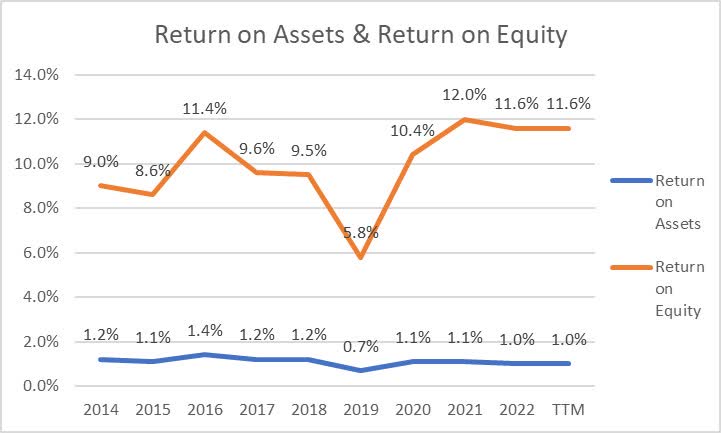 In the process of comparing PNC against its competitors, during the past decade, we can notice that PNC has the third greatest return on assets and the third highest return on equity. It is important to consider that a higher return on equity is not always superior to a lower return on equity (although it usually is) as an astute analyst should consider how much extra risk (higher leverage or risker loans) the bank took, if any to achieve the outsized returns on equity. Bearing this in mind, considering that both return on assets and return on equity have trended lower over recent years compared to earlier years and since the management team have effectively managed net charge-offs and loan book leverage, I consider the return on equity to be acceptable but not spectacular.