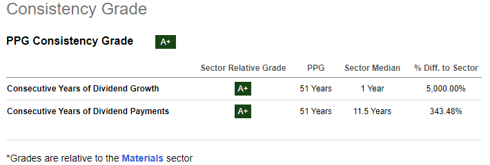 PPG’s commitment to providing shareholder values is evident in its consistent and reputable dividend history. First off, the company has paid dividends for 51 consecutive years compared to the sector’s average of 11.5 years. Further, it has grown its dividend for 51 consecutive years compared to the sector's average of 1 year. In my view, this history is not only remarkable but outrageous.