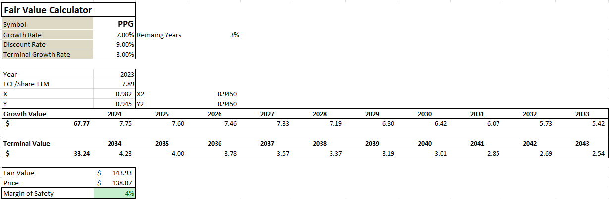Given the above assumptions and assuming the trailing FCF/share of $7.89, I arrived at a fair price of about $143.93 which translates to a 4% margin of safety. Below is my model output.