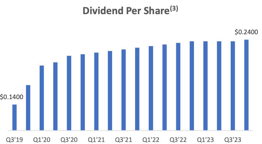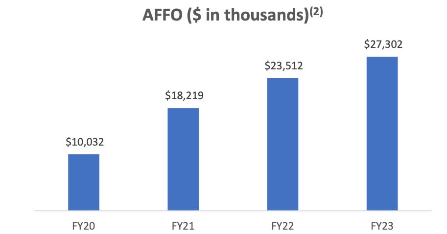 The REIT had a wonderful year acquiring properties growing their portfolio and occupancy also remained strong at nearly 100%. During 2023 they acquired more than 223 properties totaling $78 million and 8 additional properties subsequent to quarter end. These had a healthy weighted-average cap rate of 7.7%.