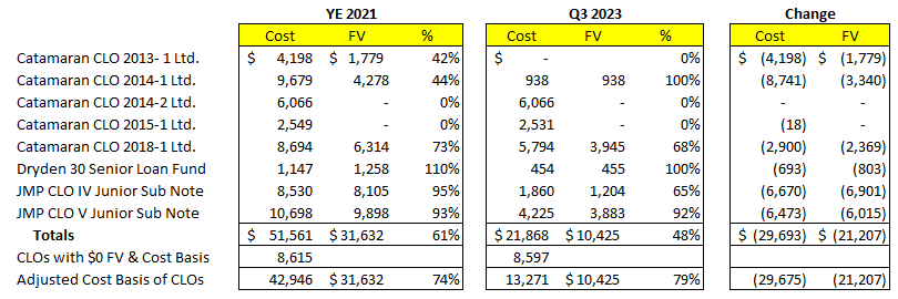 Most of PTMN’s CLO equity portfolio was included in the KCAP acquisition. PTMN did make an opportunistic investment in two CLOs (JMP Credit Advisors IV & V CLOs – (“JMP CLOs”)) in Q4 2021, paying $18.1m, $1.4m in cash and the remainder in PTMN stock. The portfolio went from 11% of total investments in Q4 2021 to 2% in Q3 2023. All the CLOs are past their reinvestment periods and are paying down the rated notes. The CLO equity portfolio will continue to dwindle over the next year or two as the CLOs are paid down and ultimately terminated.