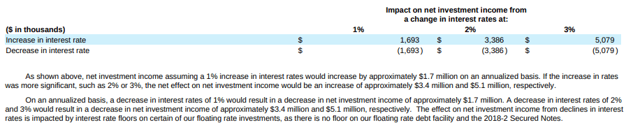 Using PTMN’s interest sensitivity schedule in its Q3 2023, see Chart 14 below, for each 200bps decrease in SORF will reduce its NII by $3.4m a year or $2.6m for 3 quarters. Given PTMN’s Q3 YTD Core NII was $22.2m or $2.32/share and its dividend was $2.07, a 200bps increase in SOFR would reduce its Core NII to $19.6m or $2.06/share, which is almost the same as its dividend. So, all things being equal, PTMN’s current dividend would still be covered if interest rates decrease by 200bps.
