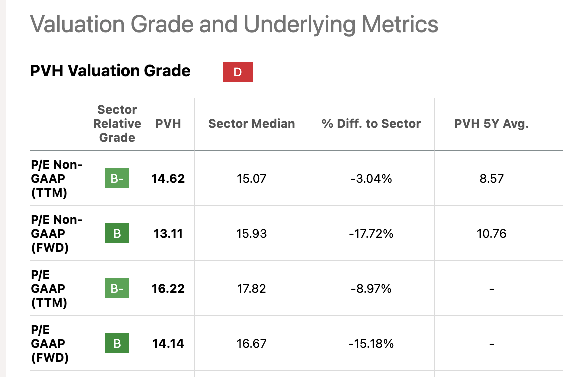 Further, the forward P/E for PVH's current financial year based on analysts' estimates on Seeking Alpha also looks good at 11.5x, as compared to that for its peers like Ralph Lauren (RL) and Levi Strauss (LEVI) at 17.1x and 15.6x.