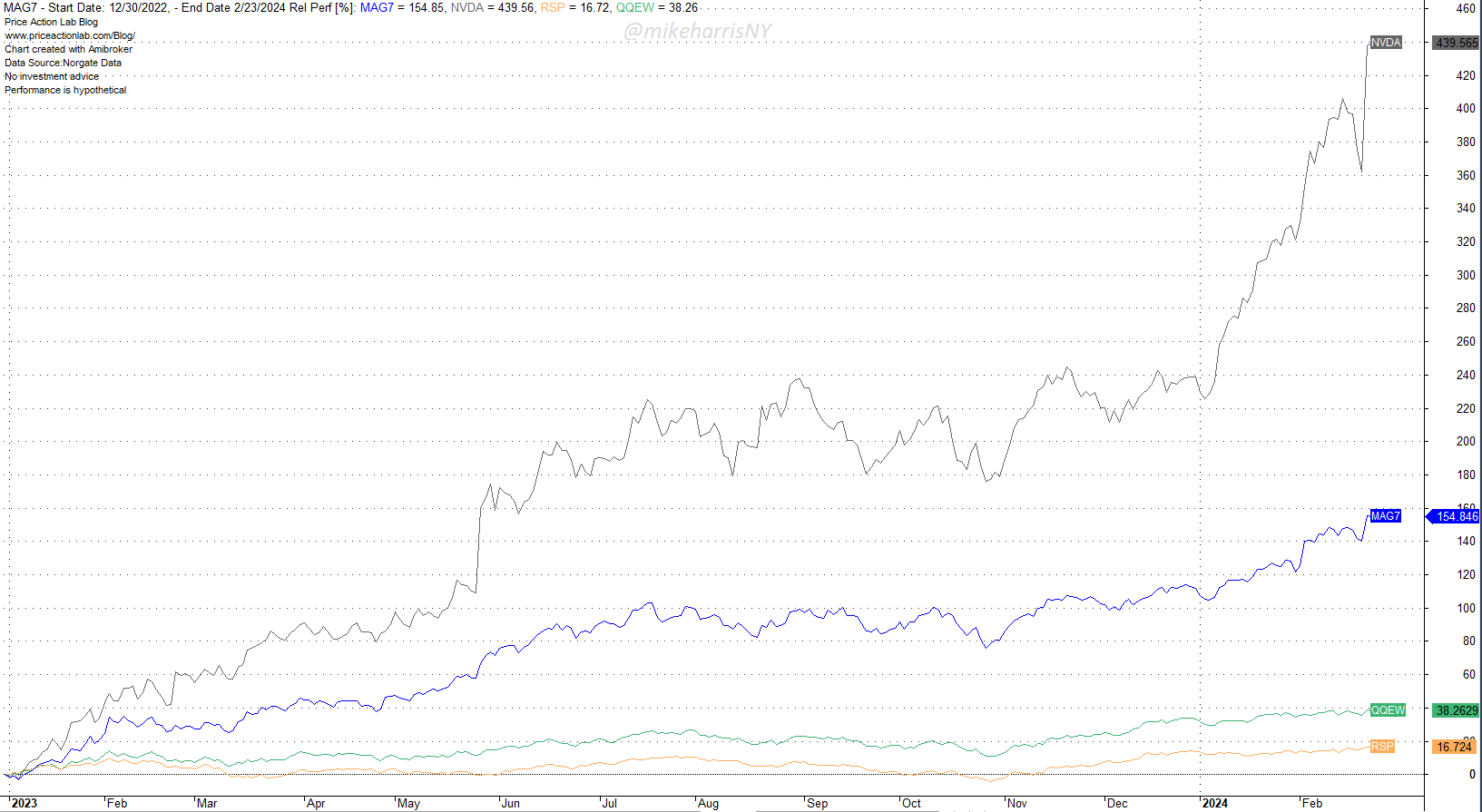Since the start of last year, NVDA is up 440%, the equal-weighted magnificent 7 (GOOG, NVDA, MSFT, META, AMZN, TSLA, and MSFT) are up 155%, but the equal-weight NASDAQ-100 (QQEW) and S&P 500 (RSP) ETFs are up 38.3% and 16.7%, respectively.