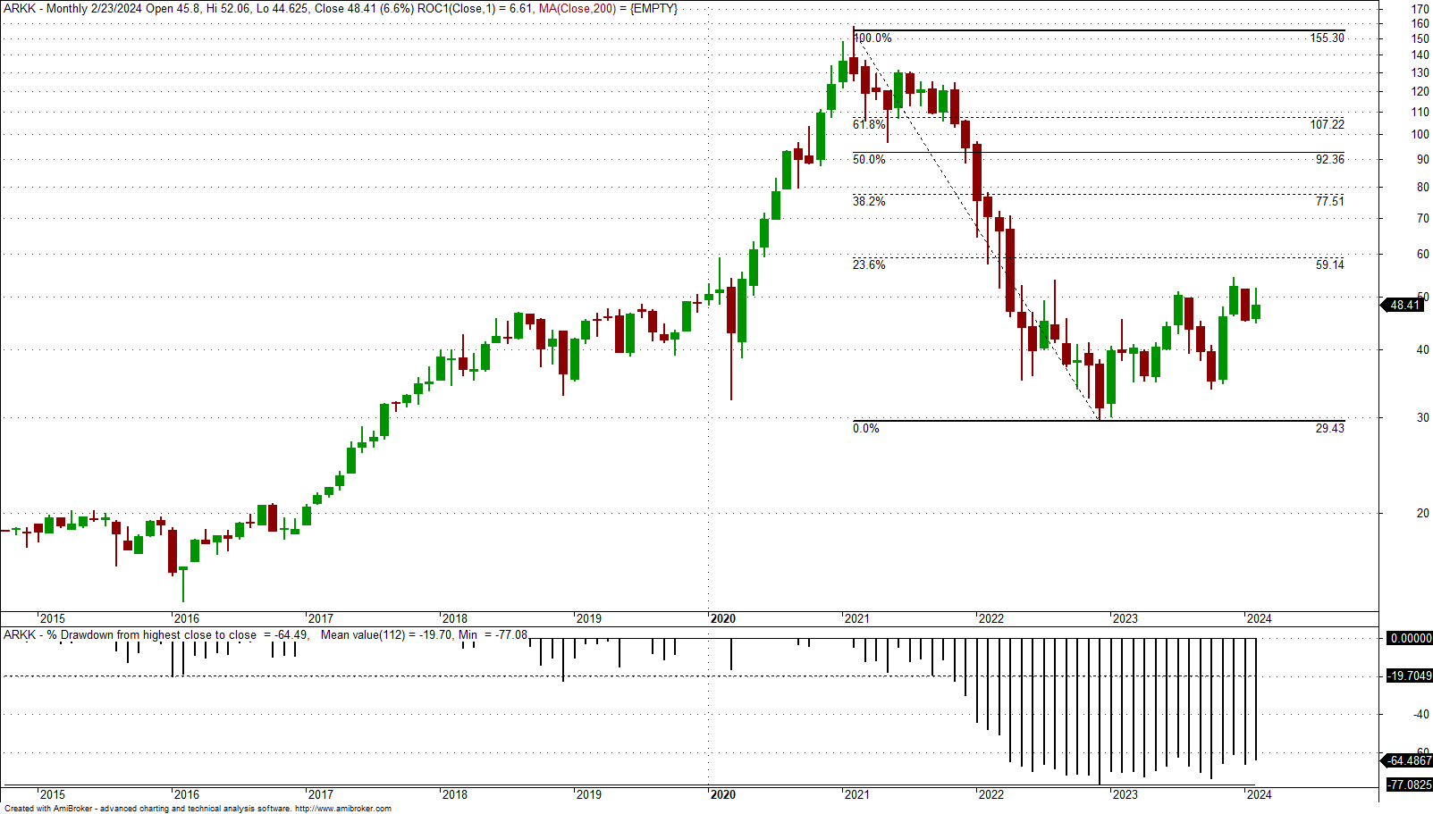 Monthly Chart of ARKK ETF with Drawdown profile (Price Action Lab Blog - Norgate Data)