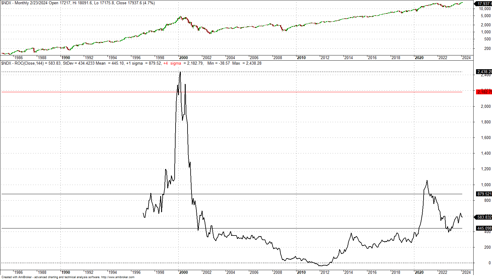 Monthly chart of NASDAQ-100 Index with rolling 144-month returns (Price Action Lab Blog - Norgate Data)