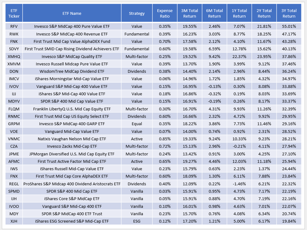 Based on its weighted average market cap, Invesco's description, and how Morningstar classifies it, I have slotted QQQJ in the mid-cap category along with 68 other ETFs in my database. In total, 53 ETFs have a three-year track record, and I'd like to present each ETF's total returns (in descending order) to show how QQQJ performed against its peers.