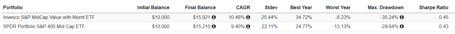 3. The performance statistics presented earlier suggest the value factor works well for mid-cap stocks. XMVM trades at just 12.07x forward earnings, or about 50% cheaper than QQQJ, and its 5.82/10 value score is the second-best in the category behind the Invesco S&P MidCap 400 Pure Value ETF (RFV). It's impressive, but I'm hesitant with these deep-value ETFs because they tend to be highly volatile. XMVM's holdings have a weighted average 1.41 five-year beta, and since it began tracking its current Index on June 21, 2019, XMVM has realized a higher standard deviation and maximum drawdown than SPMD. For this reason, I wouldn't buy it, but it might be appropriate for more aggressive investors.