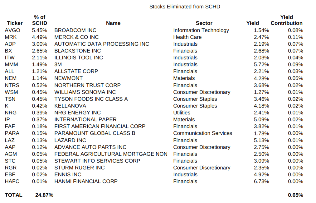 Below you can see information extracted from the Dividend Tab Seeking Alpha's Portfolio View of the 23 stocks just added to SCHD.