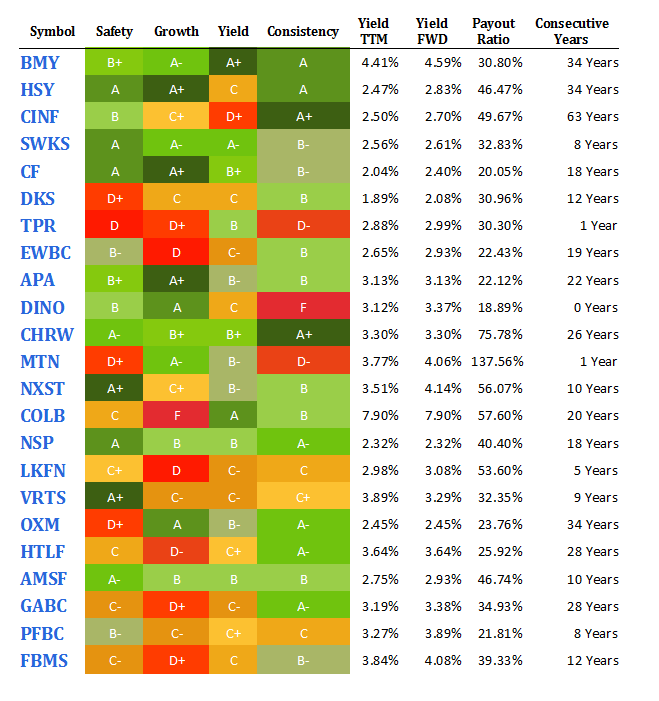 As you can see, only four of the added stocks rank highly for Dividend Safety, Dividend Growth, Dividend Yield and Dividend Consistency. Those stocks are Bristol Myers (BMY), Hershey (HSY), Skyworks (SWKS), Insperity (NSP) and Amerisafe (AMSF).