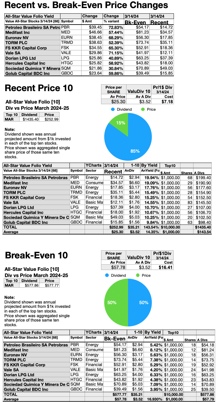 As noted above, top-ten All-Star-Value Dogs selected 3/14/24, showing the highest dividend yields, represented four of eleven sectors in the Morningstar scheme.