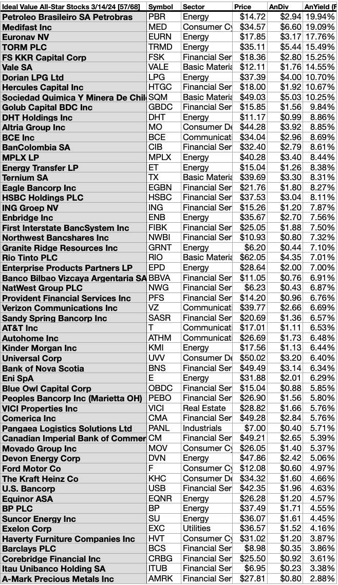 As we are now past the fourth anniversary of the 2020 Ides of March dip, the time to snap up some the 57 top-yield All-Star-Value dogs is now... unless another big bearish drop in price looms ahead. (At which time, your strategy could be to add to your position in any of these you then hold.)