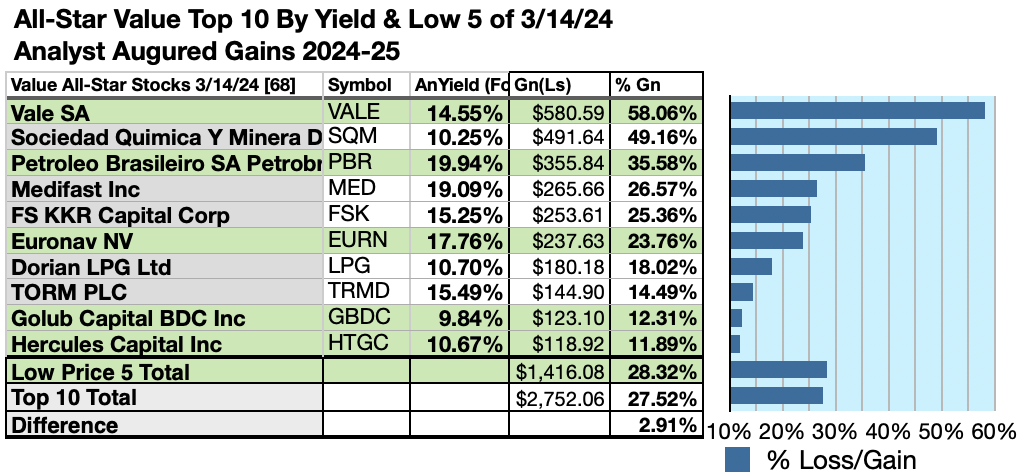 $5,000 invested as $1k in each of the five lowest-priced stocks in the top ten All-Star-Value dividend pack, by yield, were predicted by analyst 1-year targets to deliver 2.91% more gain than $5,000 invested as $.5k in all ten. The very lowest-priced All-Star-Value top-yield stock, Vale SA, was projected to deliver the best net gain of 58.06%.