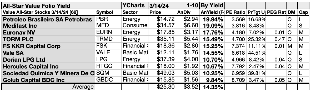Ten top All-Star-Value stocks were culled by yield for this monthly update. Those (dividend/price) results provided by YCharts did the ranking.