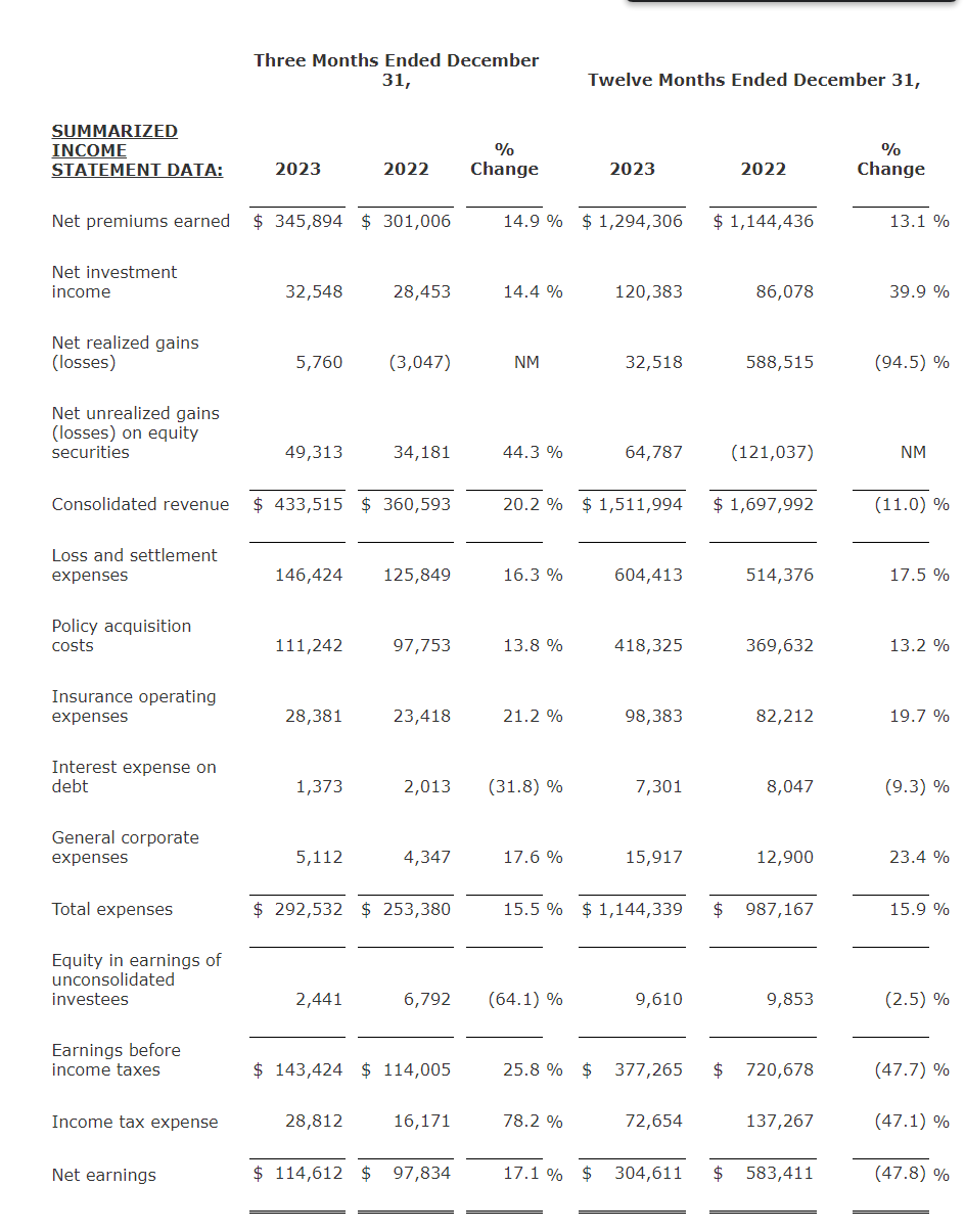 There are also mounting pressures in property too, particularly in hurricane, where after a tough season and major rate increases, limits are coming up and the market seems to be softening. Still, great underwriting profits highlighted by the property segment's 55 combined ratio (always seasonally lower, but lower than 62 in the Q4 2022) makes it an area that must be capitalised on, but the trend to a softening market is going to turn RLI off the business slightly going forward. Rate increases are really driving this business, including in E&S. In general, volumes are flat or actually declining. So they are focusing on getting the good deals rather than driving much deeper into the market. Competition is expected to continue to dial up and even accelerate into 2024, so we don't expect quite as strong a year next year for property, likely with deceleration as waning rate growth and slower rates of underwriting start to pull things down slowly.