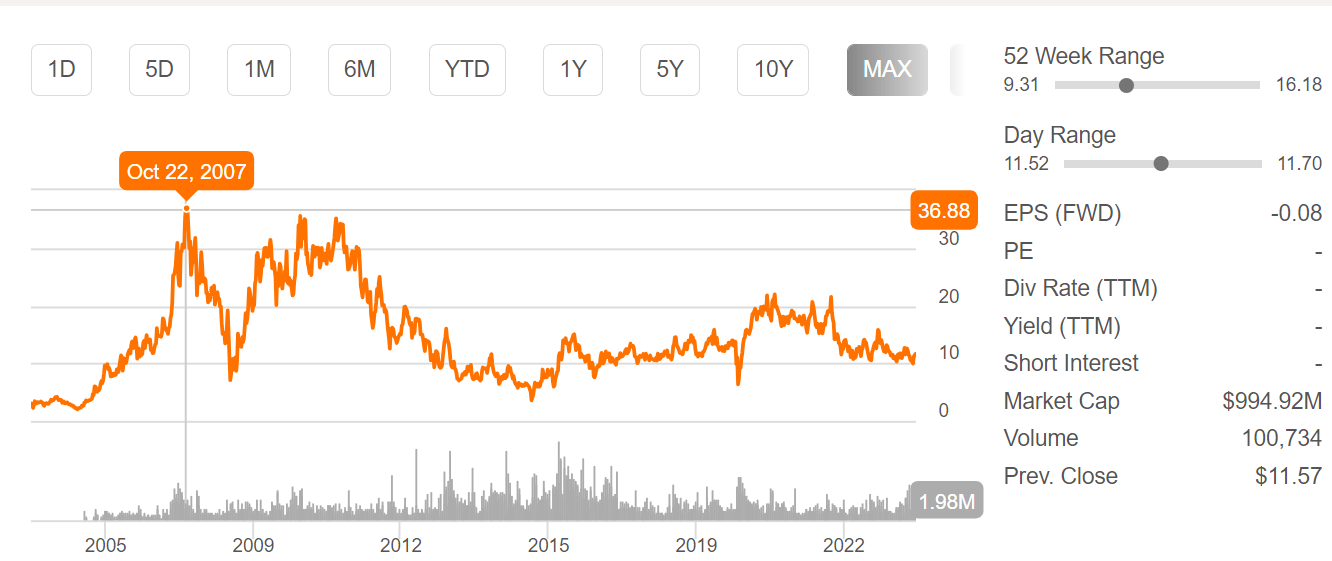 B) Valuation: I believe NPV/share is a valuable metric to assess the valuation of a mining company whose flagship project is under development. As noted earlier, the KSM Project's Technical Report estimates an after-tax NPV@5% of US$7.9 BB. Using Seabridge's fully diluted share count of ~87 MM gives an NPV/share of ~$90 against the last traded price of $11.60/share (approximately 7.7x upside). Seabridge's 20-year price chart indicates that the share price peaked at $36.88 in October 2007 (check the chart below). Interestingly, gold, copper, and silver prices in October 2007 were lower than today. At the current price levels, Seabridge appears to be trading at a significant discount based on the NPV/share of its flagship KSM Project alone. That is to say, without accounting for the impact of making arrangements for CAPEX.