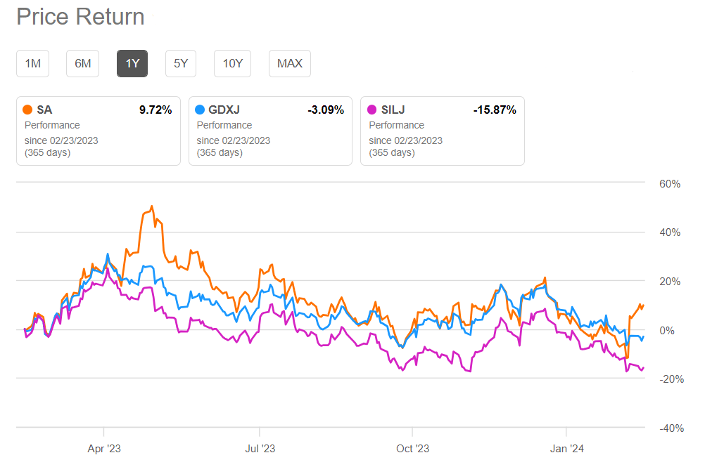 1-Year Price Returns - Seabridge Gold v/s GDXJ/SILJ - Source: Seeking Alpha Premium