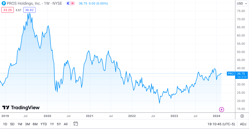 Additionally, just like PROS main competitors, Zilliant and Vendavo have gone private, PROS could potentially become the target of an acquisition. A Reuters article on September 27, 2023, hinted at this possibility as the reason for the stock jumping 13% that week to $36.18. However, the deal didn't materialize due to considerations of a low offer. Subsequently, as of the time of this writing, shares are trading hands at $36.75 as news about a potential sale have been quiet. This suggests to me that the stock is presently fairly priced.