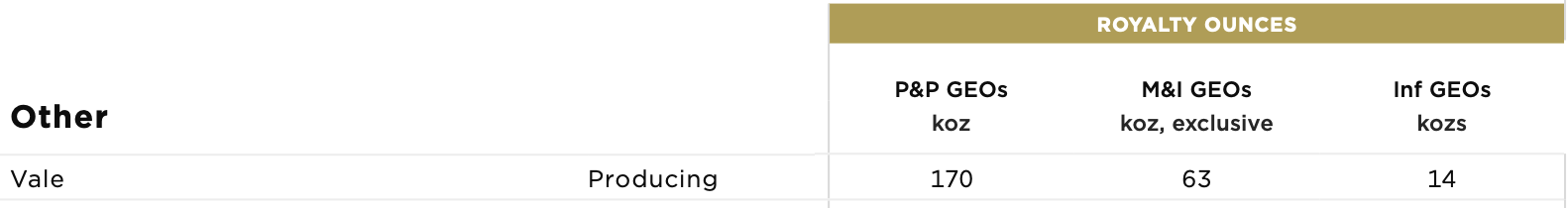 The Vale royalties currently contribute around 3,000-3,500 GEOs annually to Sandstorm. That figure will increase over the next few years and through later this decade once the Southern System royalties begin contributing and expansion projects are complete.