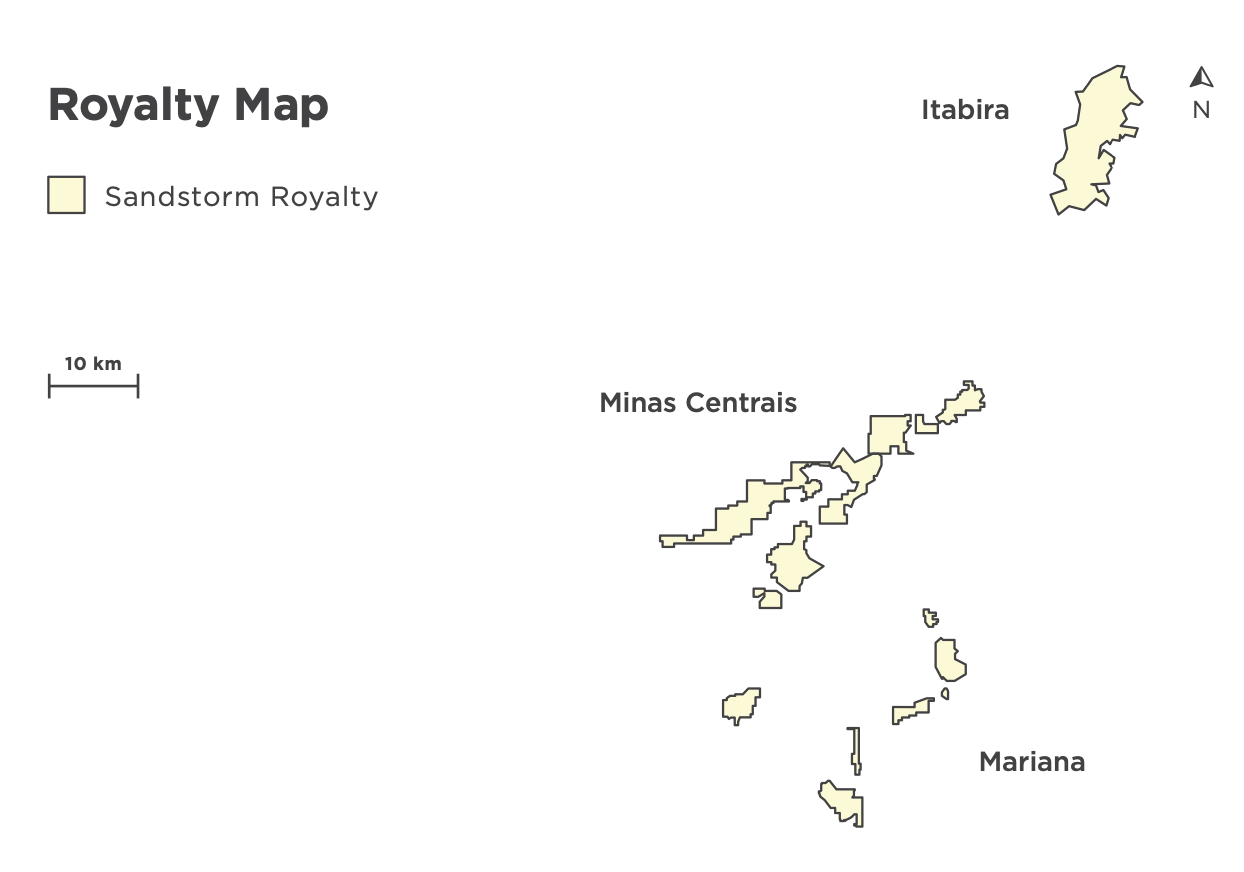 In addition, Sandstorm holds royalties on a portion of the Southeastern System, which includes three mining complexes: Itabira, Minas Centrais, and Mariana, with the latter two expected to produce through the mid to late 2050s. This asset won't begin to contribute to Sandstorm's production until a certain sales threshold is met, which is expected to occur next year.