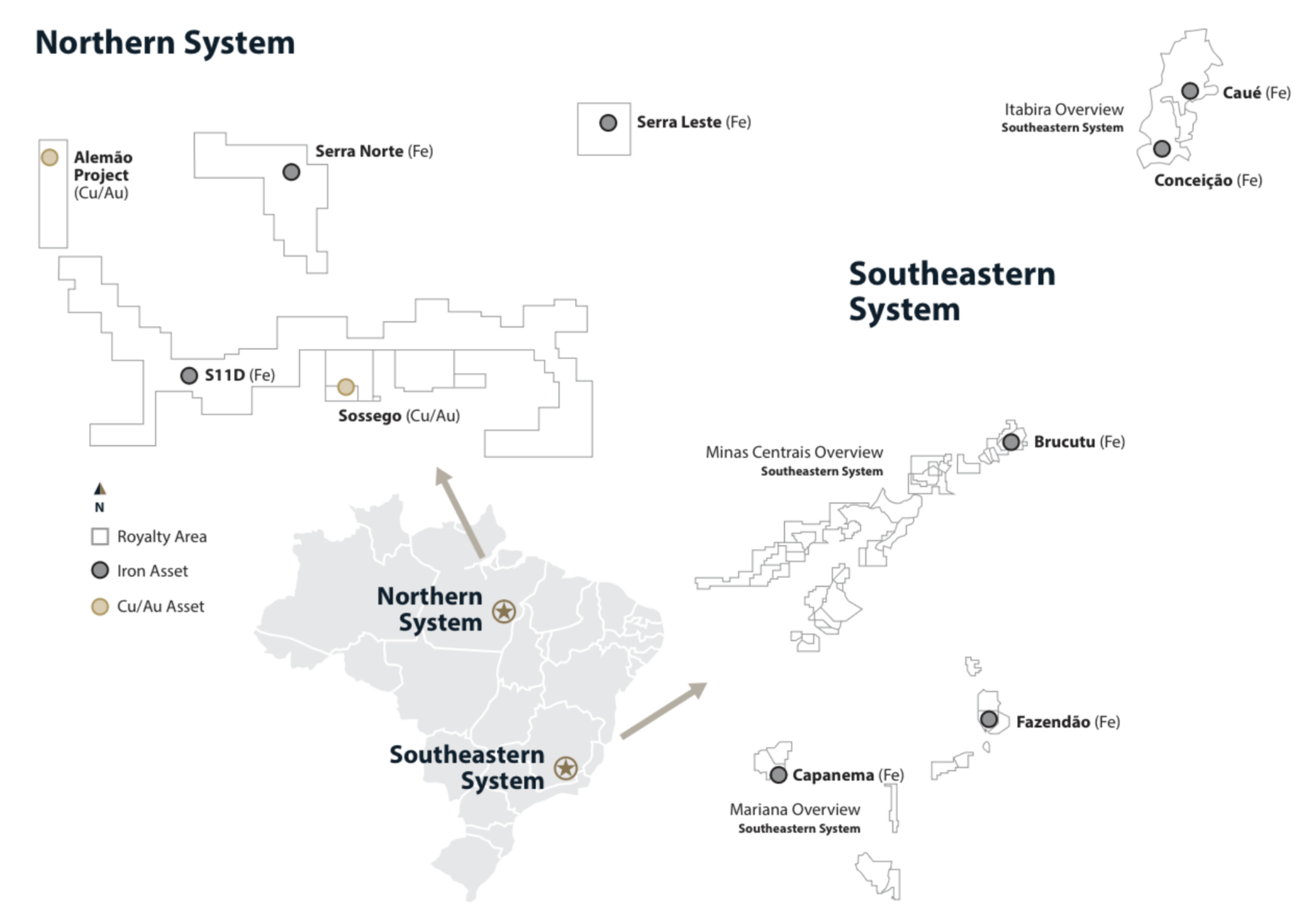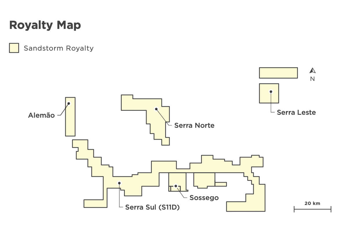 The Northern System consists of the Serra Sul, Serra Norte, and Serra Leste iron ore mines. Serra Norte began production in 1984 and, based on reserves, has a mine life of ~15 years (late 2030s). Production at Serra Leste began in 2014 and will continue into 2049, while Serra Sul will produce into the late 2050s. Vale is looking to expand Serra Sul and has other growth projects planned that could increase Sandstorm's royalty production. SAND also holds a royalty on the Sossego copper-gold mine in the Northern System, and net sales royalties on other assets on the property.