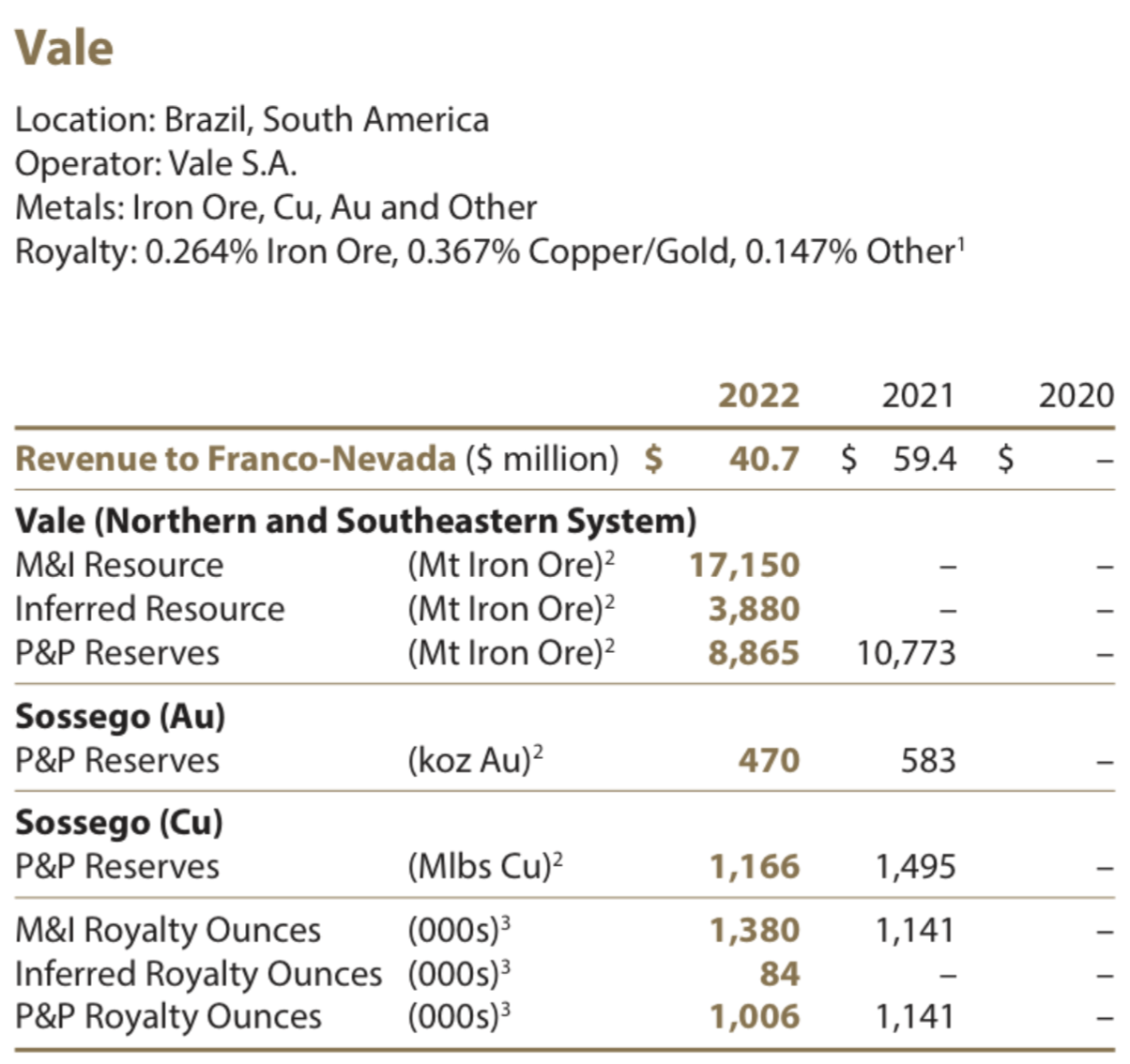 Again, using FNV as a reference, we can see over 1 million ounces of "Reserve Royalty Ounces" from its Vale royalties, or 5-6x Sandstorm's estimate. As a side note, Franco Nevada's M&I Royalty Ounces are inclusive of reserves, while Sandstorm's are exclusive. If you compare M&I Resources on an apples-to-apples basis, FNV has 374,000 M&I Royalty ounces or 5-6x what SAND lists above.